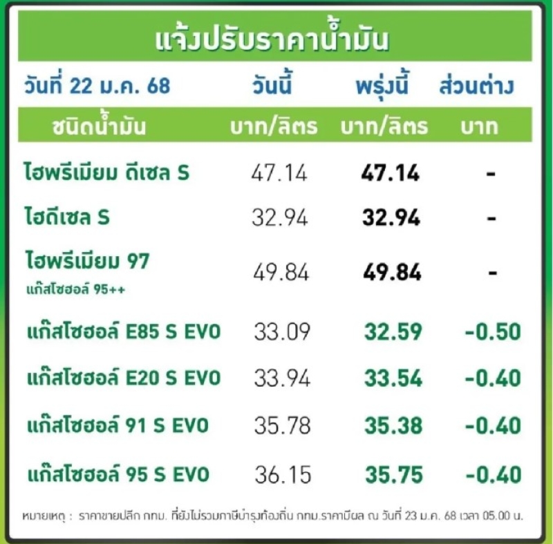 ขณะที่ บางจาก แจ้งปรับลดราคาน้ำมันกลุ่มแก๊สโซฮอล์ ยกเว้น ไฮพรีเมียม 97 และน้ำมันกลุ่มดีเซลไม่เปลี่ยนแปลง มีผลวันที่ 23 มกราคม 2568 เวลา 05.00 น.