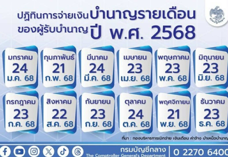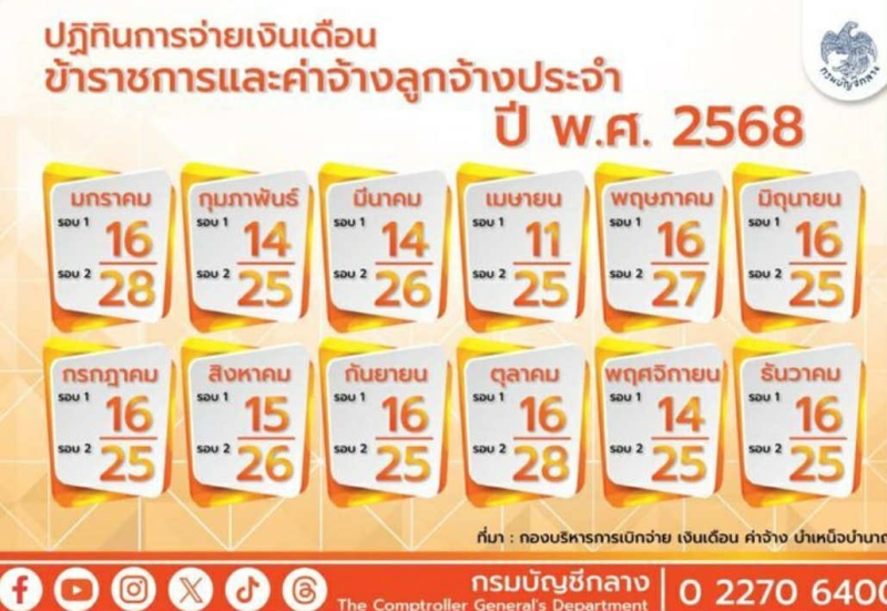 ซึ่ง เงินเดือนข้าราชการ ค่าจ้างลูกจ้างประจำ มี 2 รอบ ได้แก่ รอบ 1 วันที่ 16 มิถุนายน 2568 และรอบ 2 วันที่ 25 มิถุนายน 2568