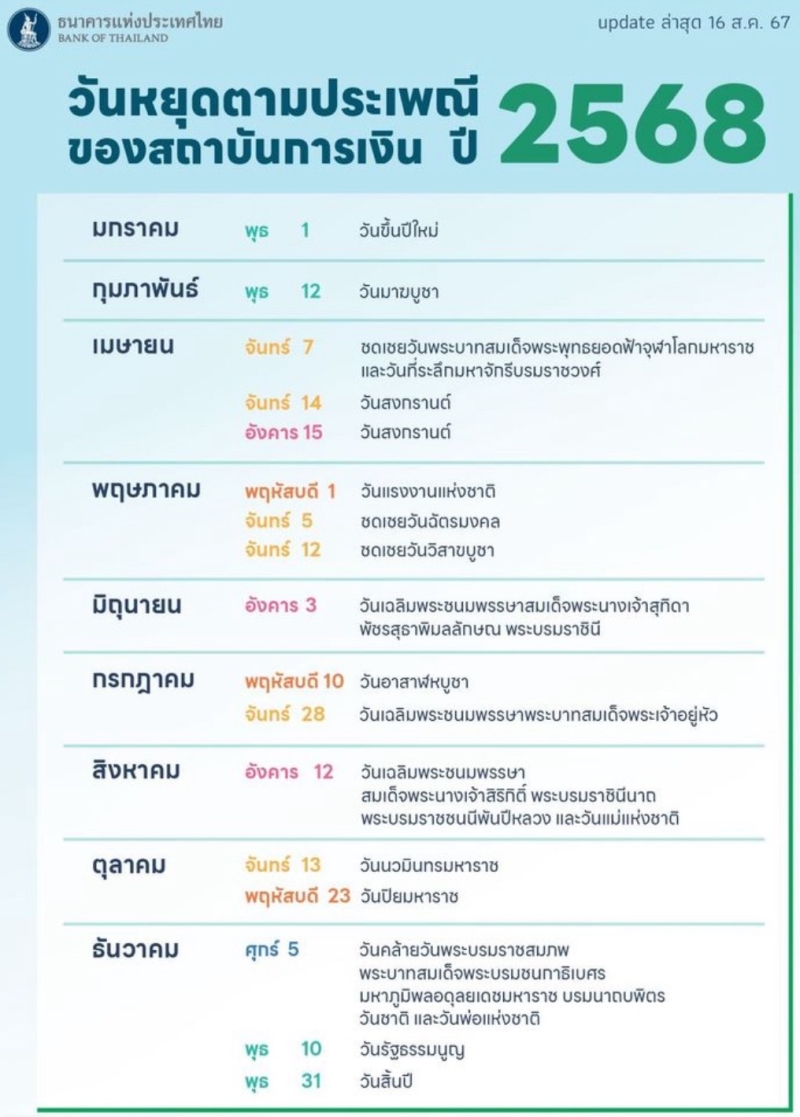 ซึ่ง ทั้งสองวันนี้ ธนาคารทุกแห่งจะปิดทำการ ยกเว้นสาขาในห้างสรรพสินค้า ที่บางแห่งอาจเปิดตามปกติ