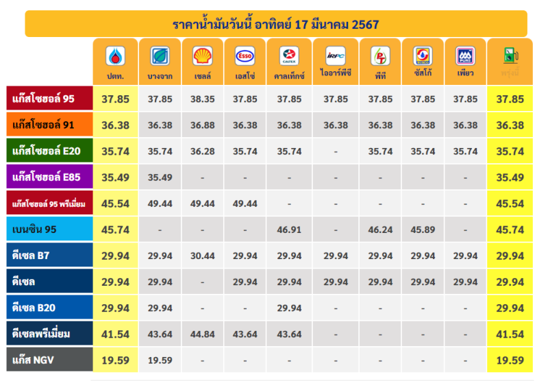 สำนักงานนโยบายและแผนพลังงาน กระทรวงพลังงาน อัปเดตราคาน้ำมันวันที่ 17-18 มีนาคม 2567 เช็กราคาน้ำมันกลุ่มเบนซิน แก๊สโซฮอล์ และดีเซล จาก ปตท.-บางจาก-เชลล์-พีที
