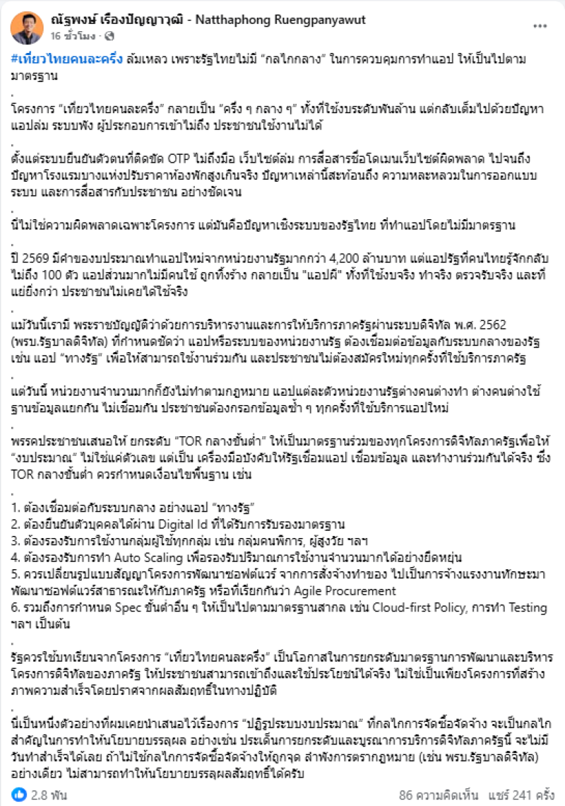 วันที่ 10 ก.ค. ที่ผ่านมานายณัฐพงษ์ เรืองปัญญาวุฒิ หัวหน้าพรรคประชาชน ได้โพสต์เฟซบุ๊กส่วนตัว ณัฐพงษ์ เรืองปัญญาวุฒิ - Natthaphong Ruengpanyawut ถึงกรณีโครงการเที่ยวไทยคนละครึ่ง โดยให้ความเห็นว่า ล้มเหลว เพราะรัฐไทยไม่มี กลไกกลาง ในการควบคุมการทำแอป ให้เป็นไปตามมาตรฐาน นายณัฐพงษ์ อีกทั้งยังระบุว่าโครงการ เที่ยวไทยคนละครึ่ง กลายเป็น ครึ่งๆกลางๆ ทั้งที่ใช้งบระดับพันล้าน แต่กลับเต็มไปด้วยปัญหา แอปล่ม ระบบพัง ผู้ประกอบการเข้าไม่ถึง ประชาชนใช้งานไม่ได้