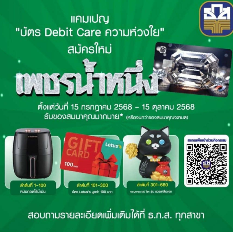 อีกทั้ง สิทธิพิเศษ เมื่อสมัครบัตรเดบิตเพชรน้ำหนึ่งที่สาขาของ ธ.ก.ส. และลงทะเบียนร่วมแคมเปญ รับของสมนาคุณสุดพิเศษ เช่น หม้อทอดไร้น้ำมันสำหรับลำดับที่ 1-100 แรก , บัตร Lotus มูลค่า 100 บาท สำหรับลำดับที่ 101-300 และกระปุกคุณ ME โชค รุ่นรวยเหลือแจก สำหรับลำดับที่ 301-660
