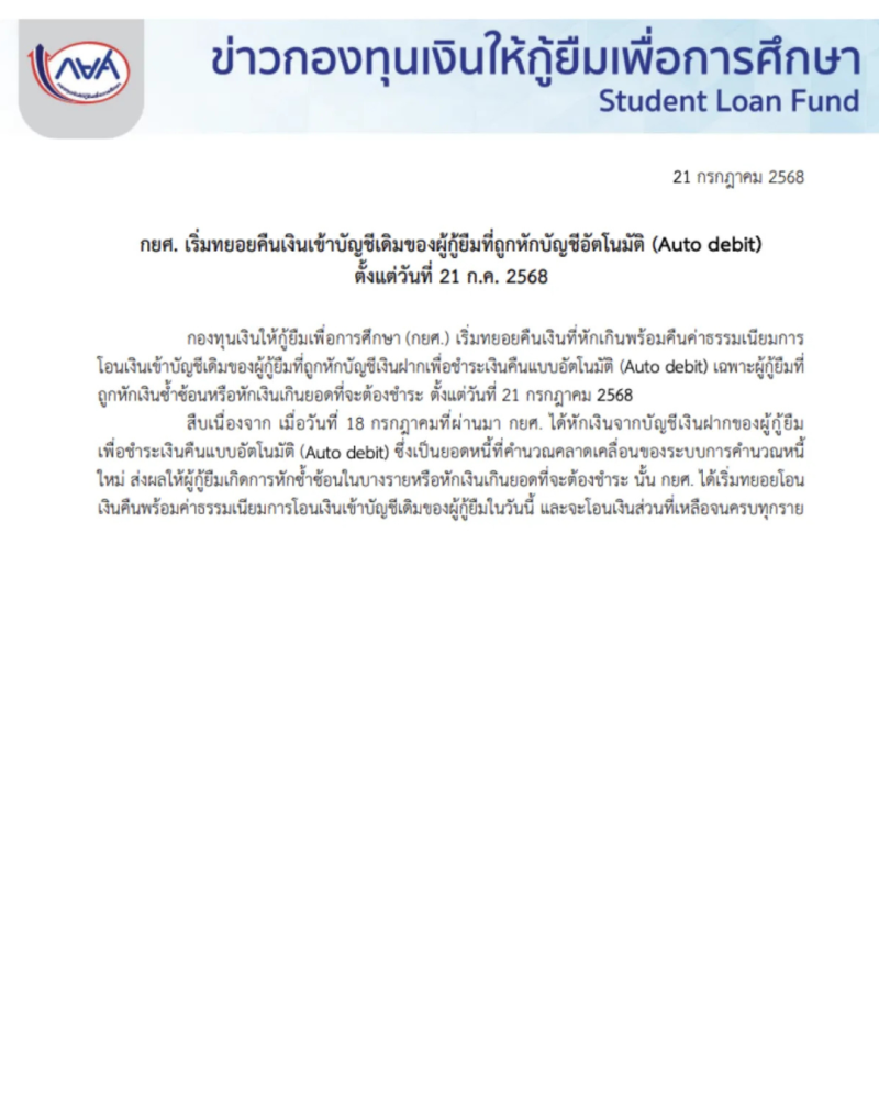 หลังจากที่เมื่อวันที่ 18 กรกฎาคม 2568 ที่ผ่านมา มีผู้กู้ยืมเงินจากกองทุนเงินให้กู้ยืมเพื่อการศึกษา (กยศ.) หลายรายออกมาโพสต์ร้องเรียนผ่านโซเชียลว่า ถูกหักเงินจากบัญชีเงินฝากโดยอัตโนมัติ (Auto debit) ทั้งที่บางคนได้ชำระหนี้ครบถ้วน หรือจ่ายเกินยอดงวดแล้ว ล่าสุด กยศ. ออกมาเคลื่อนไหวแล้ว
