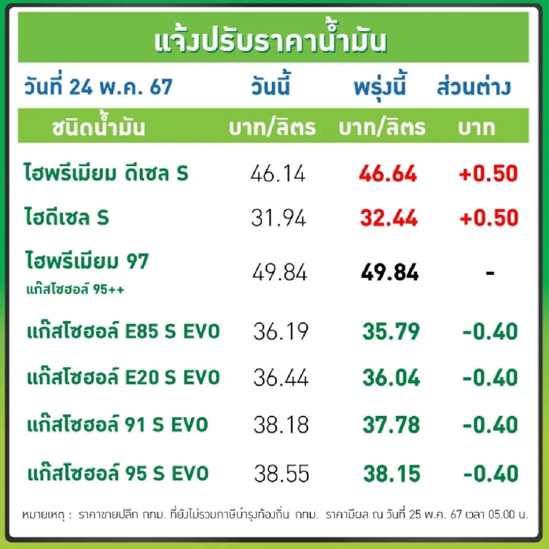 ไฮพรีเมียม ดีเซล S ราคา 46.64 บาท/ลิตร +0.50