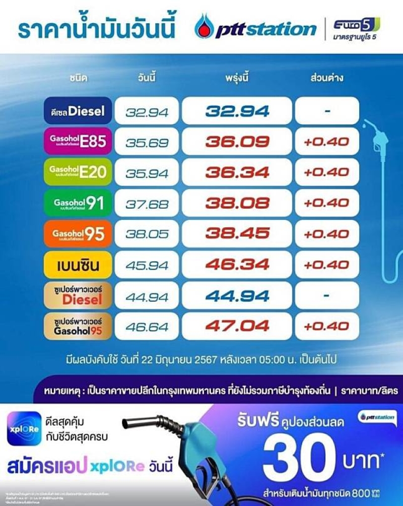 วันที่ 21 มิถุนายน 2567 PTT Station ปรับราคาขายปลีกน้ำมันกลุ่มเบนซินและแก๊สโซฮอล์ เพิ่มขึ้น 0.40 บาท/ลิตร สำหรับกลุ่มดีเซลคงเดิม มีผล 22 มิ.ย. 2567 เวลา 05.00 น.เป็นต้นไป