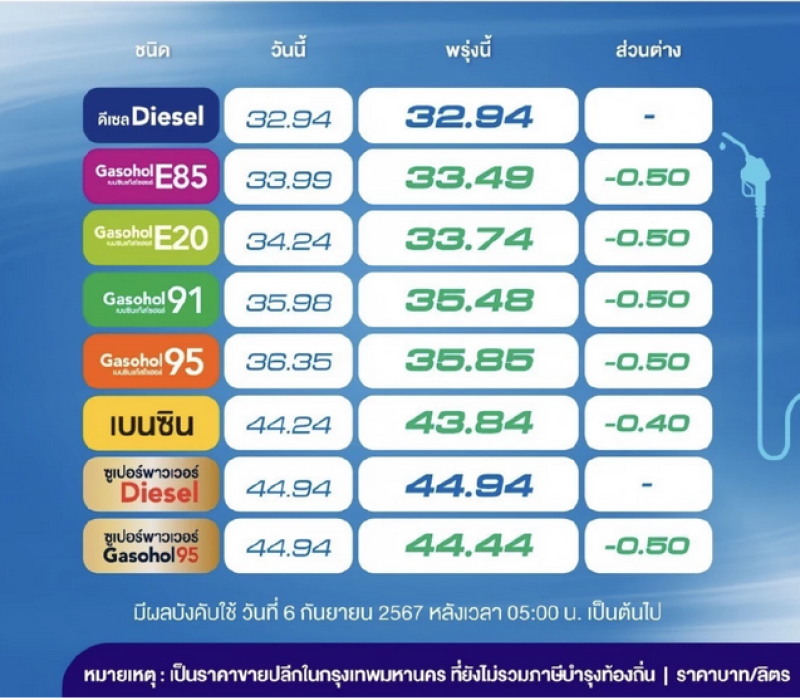 ราคาน้ำมันวันนี้ (7 ก.ย.) ปตท. บางจาก อัปเดตราคาล่าสุด ทั้งชนิดเบนซิน แก๊สโซฮอล์ และดีเซล
