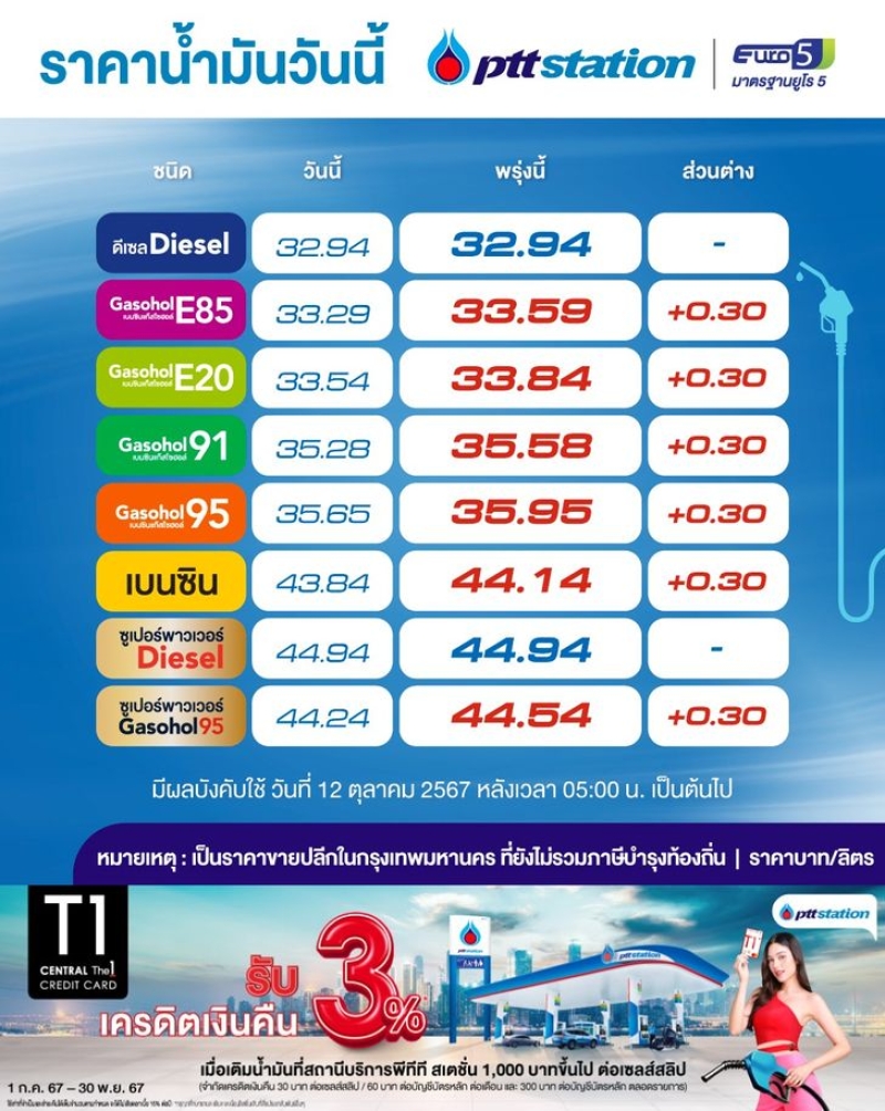 ราคาน้ำมันวันนี้ บริษัท ปตท. ราคาน้ำมันวันนี้ และการค้าปลีก จำกัด (มหาชน) หรือ PTTOR ในกลุ่มบริษัท ปตท. และบริษัท บางจาก คอร์ปอเรชั่น จำกัด (มหาชน) ปรับราคาขายปลีกน้ำมันเบนซิน แก๊สโซฮอล์ทุกชนิด และพรีเมี่ยม GSH95 ขึ้น 0.30 บาทต่อลิตร ส่วนกลุ่มดีเซลคงเดิม มีผล 12 ต.ค. 2567 เวลา 05.00 น. เป็นต้นไป