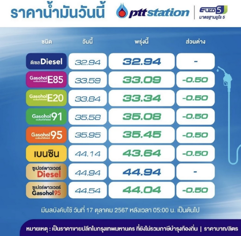 ราคาน้ำมันพรุ่งนี้2567 (20 ต.ค.) บางจาก ปตท. อัปเดตราคาล่าสุด ทั้งชนิดเบนซิน แก๊สโซฮอล์ และดีเซล