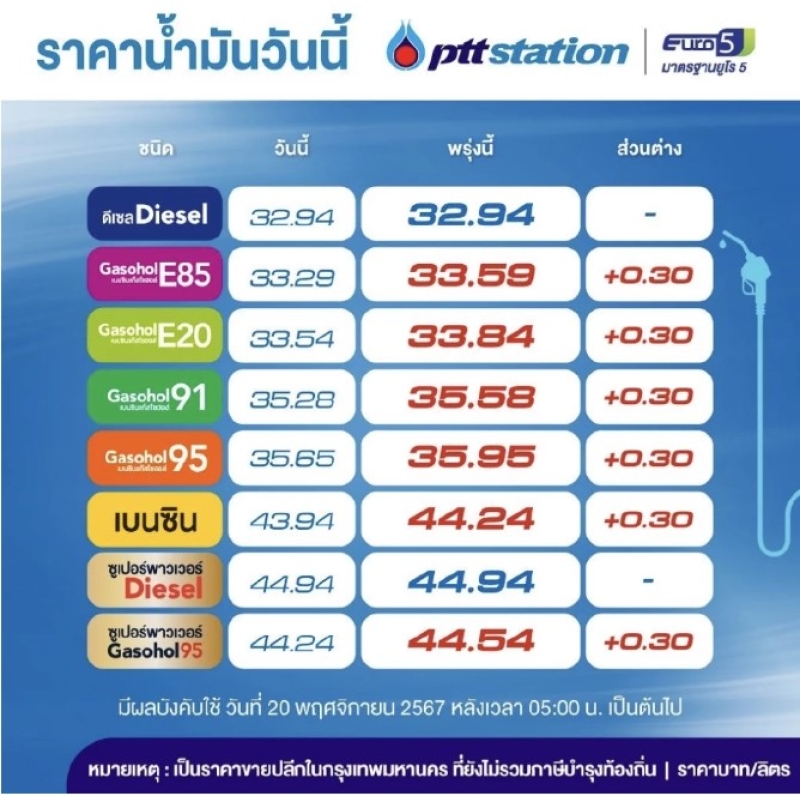แก๊สโซฮอล์ E20 ลิตรละ 33.84 บาท