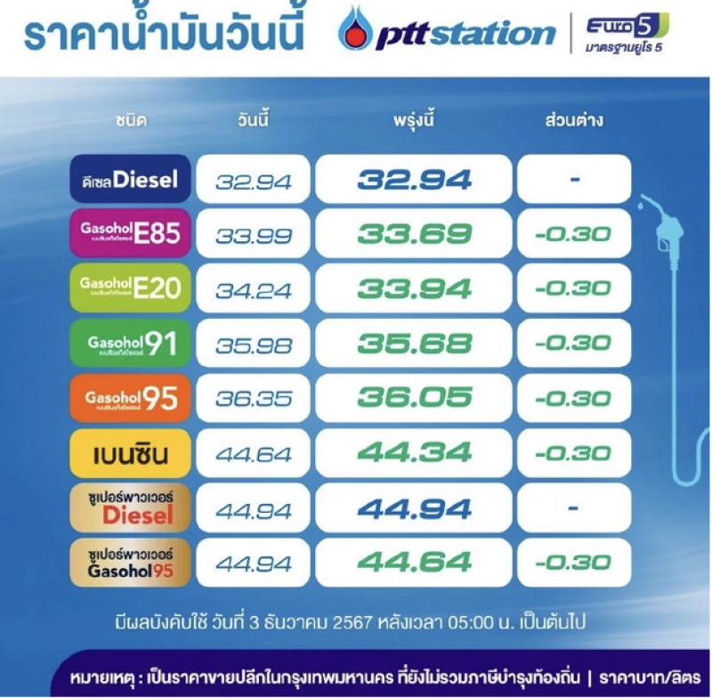 ราคาน้ำมันพรุ่งนี้2567 (8 ธ.ค.) ปตท. บางจาก อัปเดตราคาล่าสุด ทั้งชนิดเบนซิน แก๊สโซฮอล์ และดีเซล