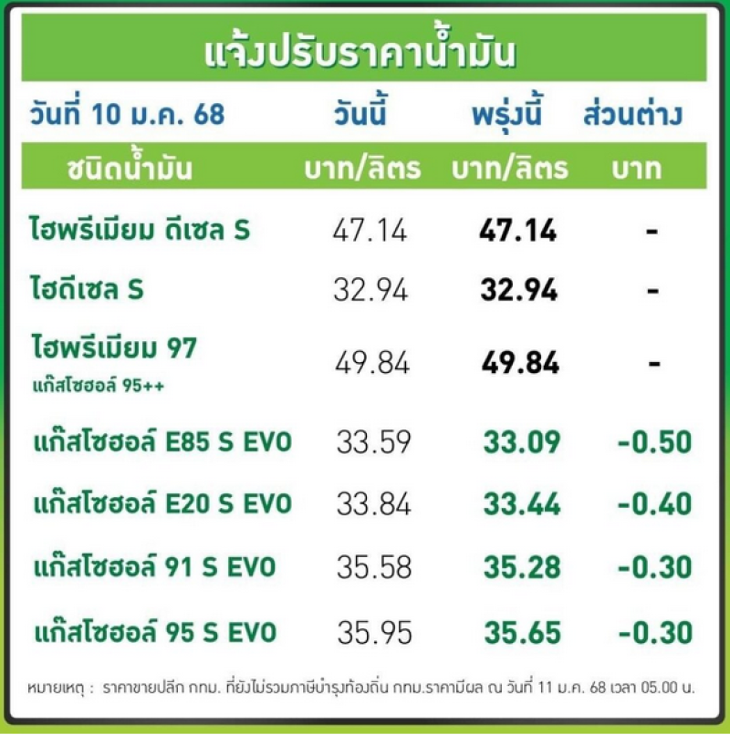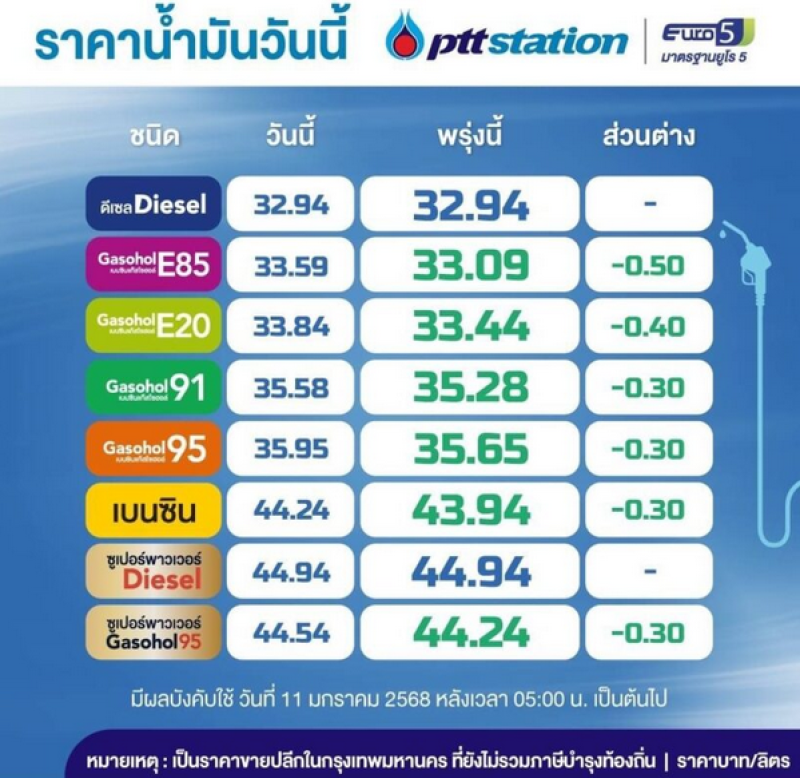 PTT Station ปรับราคาขายปลีกน้ำมันเบนซินและกลุ่มแก๊สโซฮอล์ ลดลง 0.30 บาท/ลิตร ยกเว้น แก๊สโซฮอล์ E20 ลด 0.40 บาท/ลิตร และแก๊สโซฮอล์ E85 ลด 0.50 บาท/ลิตร สำหรับกลุ่มดีเซลคงเดิม มีผล 11 ม.ค. 2568 เวลา 05.00 น.เป็นต้นไป