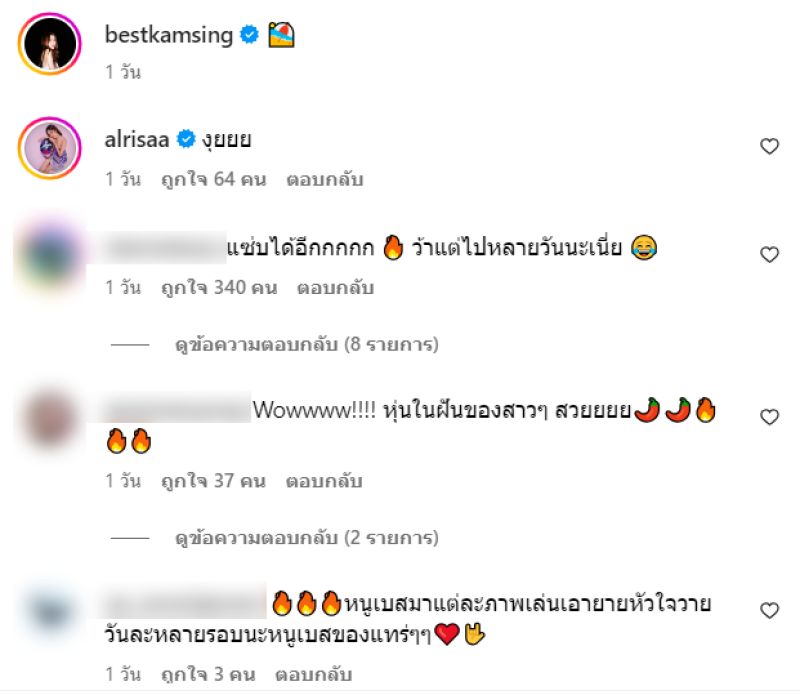 งานนี้ มีชาวเน็ตเข้ามาคอมเมนต์กันจำนวนมาก เช่น แซ่บได้อีกกกกก ว้าแต่ไปหลายวันนะเนี่ย,Wowwww!!!! หุ่นในฝันของสาวๆ สวยยยย,หนูเบสมาแต่ละภาพเล่นเอายายหัวใจวายวันละหลายรอบนะหนูเบสของแทร่ๆๆ,สวยๆๆๆแซ่บๆๆๆชอบ! เอาอีก เป็นต้น