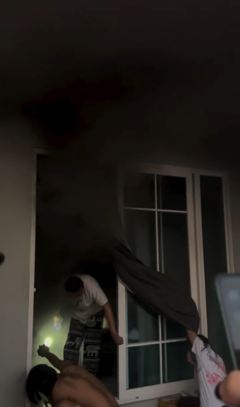อาไท : วันที่ 25 ผมชาร์จพัดลมปิกนิกที่เราเอาไปกางเต็นท์ไว้ ผมชาร์จตอนประมาณตี 4 ครึ่งเพราะว่าผมขึ้นห้องนอนตอน 4 ครึ่ง แล้วก็ตอนประมาณ 6 โมงนิดๆผมได้ยินเสียงปังเหมือนคนทะเลาะกัน ผ่านไป 2-3 นาทีตะหงิดเพราะเสียงดังมากก็เลยเปิดประตูออกไปจะลงไปชั้นล่างเราเห็นมีควันอ่อนๆ แล้ว มีกลิ่นไหม้แล้ว ไม่ใช่แล้ว ผมเลยปิดประตูโทรหาแม่ แม่อยู่ห้องข้างๆ แม่ผมเพิ่งมาจากสกลนคร แม่ตื่นต้องออกจากบ้านตอนนี้เลย ผมก็เก็บของใส่กระเป๋าเปิดประตูรอบที่ 2 ควันตีหน้าเลย ควันดำ มันมองอะไรไม่เห็นเลย ทุกอย่างเกิดขึ้นเร็วมากเลย