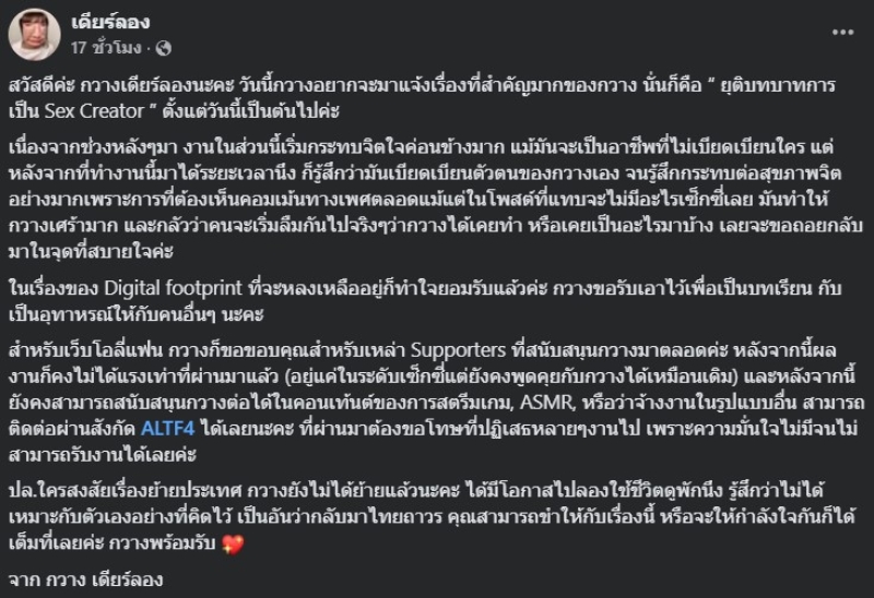 พร้อมประกาศขอยุติบทบาทสำหรับการทำคอนเทนต์ดังกล่าวอย่างถาวร ก่อนจะเผยถึงสาเหตุว่า หลังจากที่ได้ทำงานนี้มาได้สักระยะ รู้สึกว่ากระทบต่อสุขภาพจิตของเธอเป็นอย่างมาก ทั้งยังรู้สึกว่า คอมเมนต์ในทุกช่องทาง ต่างเต็มไปด้วยคอมเมนต์เรื่องทางเพศตลอด แม้แต่โพสต์ที่แทบไม่มีอะไรเซ็กซี่ ซึ่งมันทำให้เธอเศร้ามาก ดังนั้น จึงขอถอยกลับมาอยู่ในจุดที่สบายใจ พร้อมกล่าวปิดท้ายว่า ตนจะยังผลิตคอนเทนต์ จำพวก สตรีมเกม ทำ ASMR ให้ทุกคนได้ติดตามกันอย่างปกติเหมือนเช่นเคย
