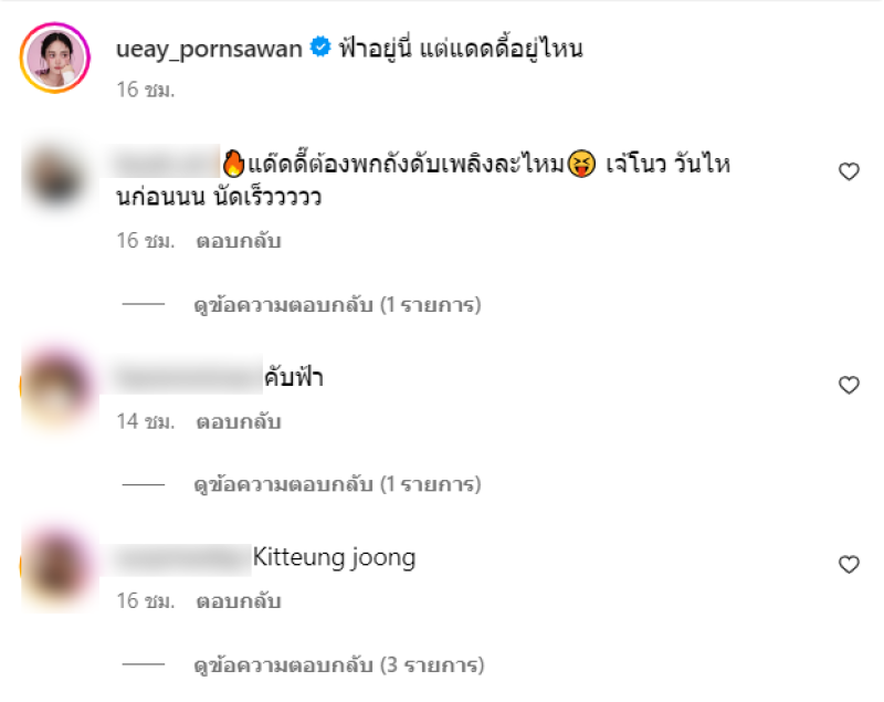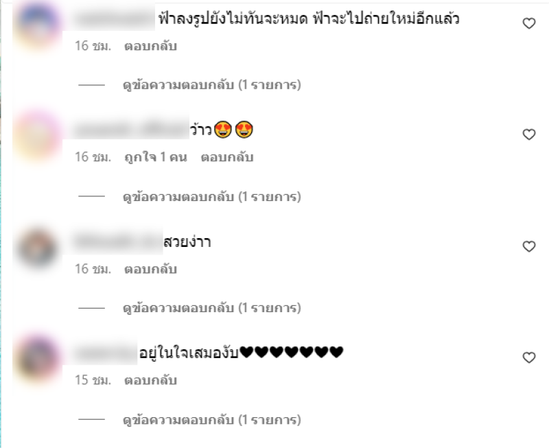 ท่ามกลาง เพื่อนๆในวงการและชาวเน็ตเข้ามาคอมเมนต์กันจำนวนมาก อาทิ แด๊ดดี๊ต้องพกถังดับเพลิงละไหม เจ้โนว วันไหนก่อนนน นัดเร็ววววว,ฟ้าลงรูปยังไม่ทันจะหมด ฟ้าจะไปถ่ายใหม่อีกแล้ว,หวานซ่อนเปรี้ยว,น้ำทะเลหวานน่าดู เป็นต้น