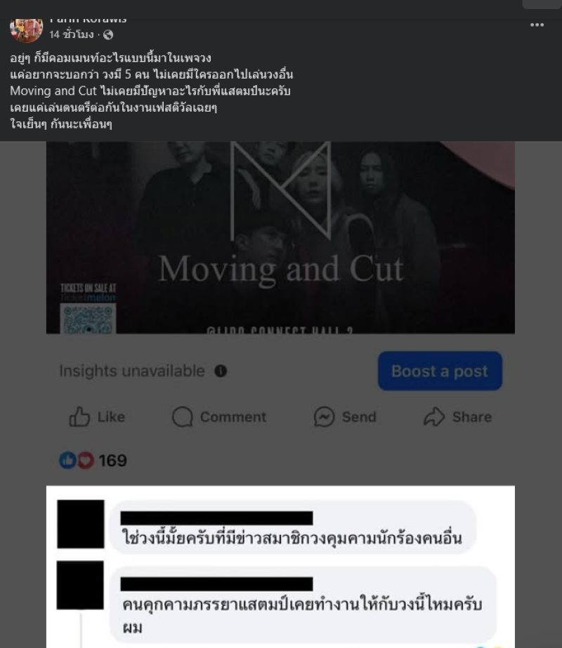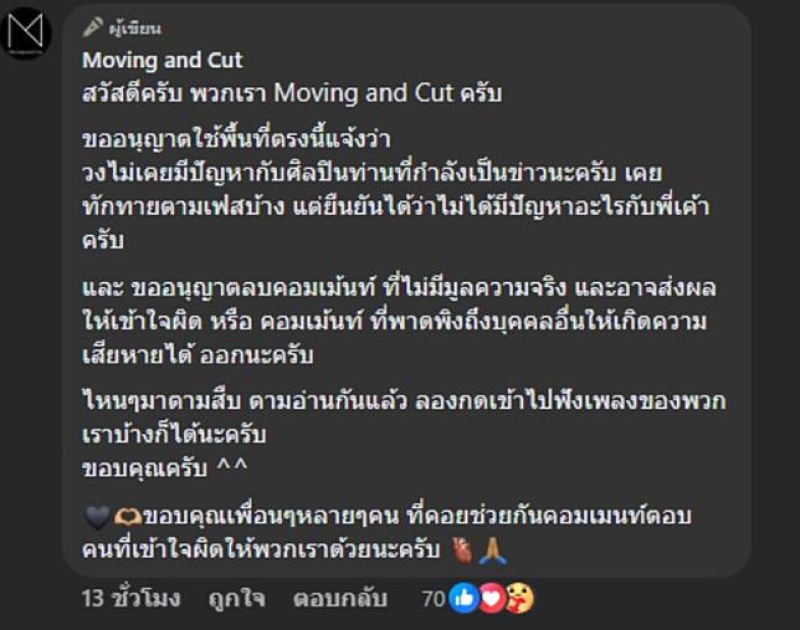 อยู่ๆ ก็มีคอมเมนท์อะไรแบบนี้มาในเพจวง แค่อยากจะบอกว่า วงมี 5 คน ไม่เคยมีใครออกไปเล่นวงอื่น Moving and Cut ไม่เคยมีปัญหาอะไรกับพี่แสตมป์นะครับ เคยแค่เล่นดนตรีต่อกันในงานเฟสติวัลเฉยๆ ใจเย็นๆ กันนะเพื่อนๆ ทั้งนี้ทางด้านเฟซบุ๊กของวง Moving and Cut ได้คอมเมนต์เพิ่มเติมว่า สวัสดีครับ พวกเรา Moving and Cut ครับ