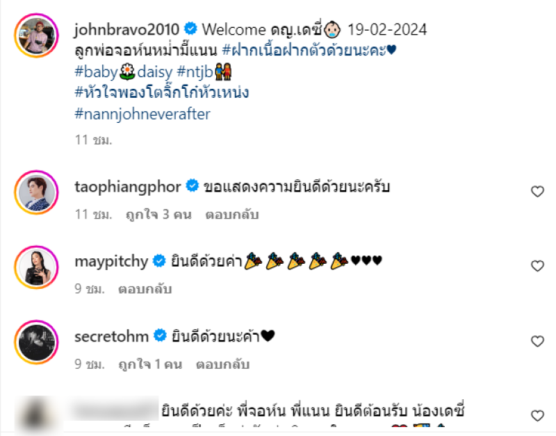 เรียกได้ว่า เป็นนักแสดงมากฝีมือ และได้ขึ้นแท่นเป็นคุณพ่อป้ายแดง อย่าง จอห์น บราโว ที่เมื่อล่าสุด ได้คลอดลูกคนเเล้วพร้อมตั้งชื่อสุดน่ารักว่าน้องเดซี่ โดยผ่านทางอินสตาแกรม พร้อมระบุข้อความว่า Welcome ดญ.เดซี่ 19-02-2024 ลูกพ่อจอห์นหม่่ามี๊แนน #ฝากเนื้อฝากตัวด้วยนะคะ #baby daisy #ntjb #หัวใจพองโตจิ๊กโก๋หัวเหน่ง