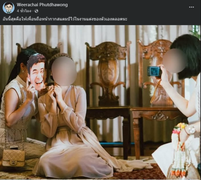 ล่าสุดทางด้านเพจเฟซบุ๊คของ อ.อ๊อด รศ.ดร.วีระชัย พุทธวงศ์ Weerachai Phutdhawong ได้ออกมาเผยภาพงานวิวาห์ของฝ่ายหญิง ที่ให้เพื่อนถือหน้ากากแสตมป์ไว้ในแต่งตัวเอง พร้อมระบุเเคปชั่นว่า อันนี้สุด คือให้เพื่อนถือหน้ากากแสตมป์ไว้ในงานแต่งของตัวเองตลอดนะ