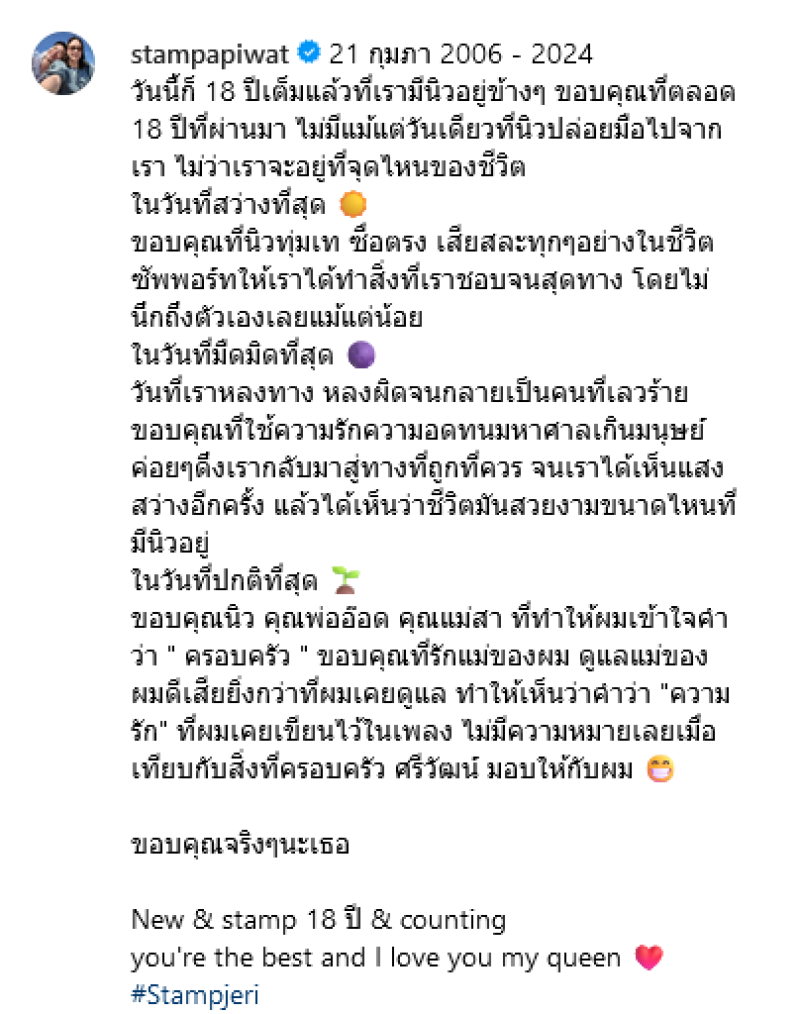 ขอบคุณที่รักแม่ของผม ดูแลแม่ของผมดีเสียยิ่งกว่าที่ผมเคยดูแล ทำให้เห็นว่าคำว่า ความรัก ที่ผมเคยเขียนไว้ในเพลง ไม่มีความหมายเลยเมื่อเทียบกับสิ่งที่ครอบครัว ศรีวัฒน์ มอบให้กับผม ขอบคุณจริงๆ นะเธอ New stamp 18 ปี counting you're the best and I love you my queen #Stampjeri