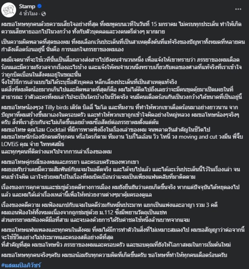 ก็ต้องบอกเลยว่า จากอัปเดตข่าวล่าสุด สำหรับปมดราม่าสุดเดือดของนักร้องหนุ่ม อย่าง แสตมป์ อภิวัชร์ ได้ออกมาเคลื่อนไหวผ่านเพจเฟสบุ๊ก Stamp พร้อมระบุแคปชั่นในทำนองว่า ขอโทษทุกคนด้วยความเสียใจอย่างที่สุด สืบเนื่องจากที่ตนพูดไปบนเวทีในวันที่ 15 มกราคม ไม่ครบทุกประเด็น