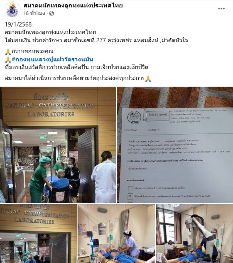 เรียกได้ว่า นักร้องลูกทุ่งรุ่นใหญ่ อย่าง รุ่งเพชร แหลมสิงห์ ที่กำลังเข้าการผ่าตัด โดยทางเพจ สมาคมนักเพลงลูกทุ่งแห่งประเทศไทย ได้ออกมาโพสต์ว่า 19/1/2568 สมาคมนักเพลงลูกทุ่งแห่งประเทศไทย ได้มอบเงิน ช่วยค่ารักษา สมาชิกเลขที่ 277 ครูรุ่งเพชร แหลมสิงห์ ,ผ่าตัดหัวใจ