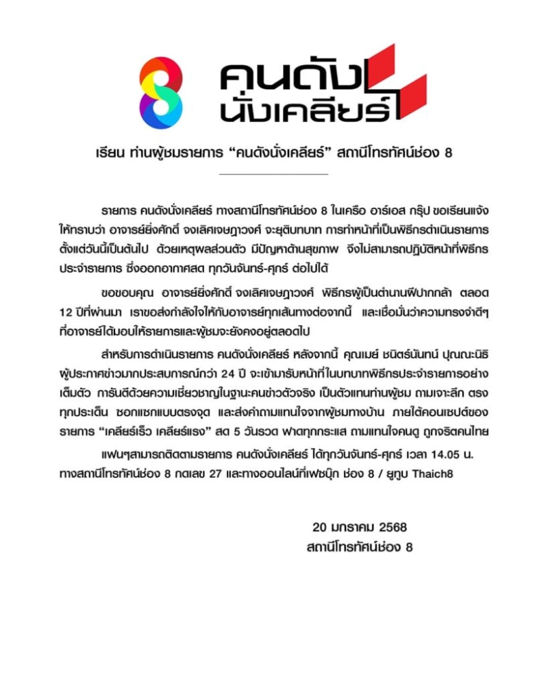 ตนมีปัญหาในเรื่องของสุขภาพ จึงไม่สามารถปฏิบัติหน้าที่พิธีกรประจำรายการ ซึ่งออกอากาศสด ทุกวันจันทร์-ศุกร์ ต่อไปได้ ทั้งยังแจ้งเพิ่มเติมอีกด้วยว่า หลังจากนี้ ด้าน เมย์ ชนิตร์นันทน์ ปุณณะนิธิ จะมาเป็นผู้ประกาศข่าวช่อง 8 และรับหน้าที่พิธีกรประจำรายการ คนดังนั่งเคลียร์ อย่างเต็มตัวแทนตน ซึ่งหลังจากที่ด้านเจ้าตัวได้ออกมาแจ้งอย่างเป็นทางการ ก็ทำเอาชาวเน็ตต่างพากันเสียดาย พร้อมเผยไปในทิศทางเดียวกันว่า เสียดายมาก เพราะเป็นพิธีกรที่เก่งแถมมีเอกลักษณ์เฉพาะตัวสุดๆ