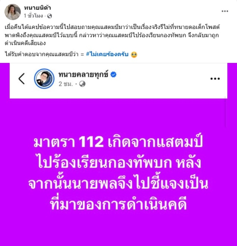 ล่าสุด ทนายนิด้า ทนายความของ แสตมป์ ได้ออกมาเคลื่อนไหว หลังมีการสอบถามเรื่องราวดังกล่าวไปกับแสตมป์ ก็ได้คำตอบว่า เมื่อคืนได้แคปข้อความนี้ไปสอบถามคุณแสตมป์มาว่าเป็นเรื่องจริงรึไม่ที่ทนายดอเด็กโพสต์พาดพิงถึงคุณแสตมป์ไว้แบบนี้ กล่าวหาว่าคุณแสตมป์ไปร้องเรียนกองทัพบก จึงกลับมาถูกดำเนินคดีเสียเอง ได้รับคำตอบจากคุณแสตมป์ว่า = #ไม่เคยร้องครับ