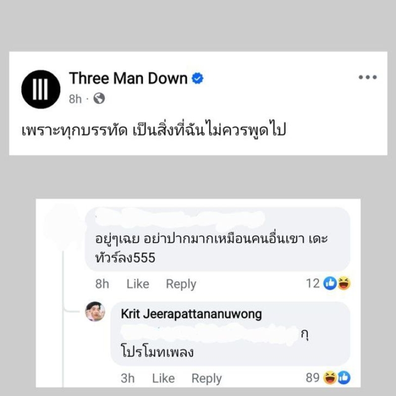 โดยด้าน กิต Three Man Dowm ก็ไม่รอดพ้นเช่นเดียวกัน เนื่องจากเจ้าตัวได้ออกมาโพสต์สเตตัสในทำนองว่า เพราะทุกบรรทัด เป็นสิ่งที่ฉันไม่ควรพูดไป ซึ่งในเวลาต่อมา ก็ได้มีชาวเน็ตรายหนึ่ง เข้ามาแสดงความคิดเห็น ถึงโพสต์ดังกล่าวของกิตว่า อยู่เฉยๆ อย่าปากมากเหมือนคนอื่นเขา เดี๋ยวทัวร์ลง 5555 ทำเอาเจ้าตัวรีบตอบกลับเลยว่า กูโปรโมทเพลง งานนี้เรียกเสียงฮาจากแฟนๆไม่น้อยกันเลยทีเดียว กับคำตอบของหนุ่มกิตที่อยู่ดีๆก็โยงเข้าเรื่องดราม่าแบบไม่รู้ตัว