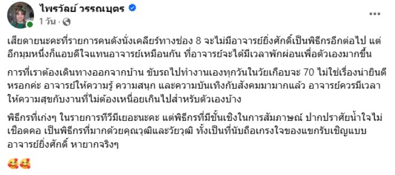 ล่าสุด ทาง แพรรี่ ไพรวัลย์ ในฐานะคนที่เคยร่วมงานกับ อาจารย์ยิ่งศักดิ์ ได้โพสต์ข้อความซึ้งถึงอาจารย์ว่า เสียดายนะคะที่รายการคนดังนั่งเคลียร์ทางช่อง 8 จะไม่มีอาจารย์ยิ่งศักดิ์เป็นพิธีกรอีกต่อไป แต่อีกมุมหนึ่งก็แอบดีใจแทนอาจารย์เหมือนกัน ที่อาจารย์จะได้มีเวลาพักผ่อนเพื่อตัวเองมากขึ้น