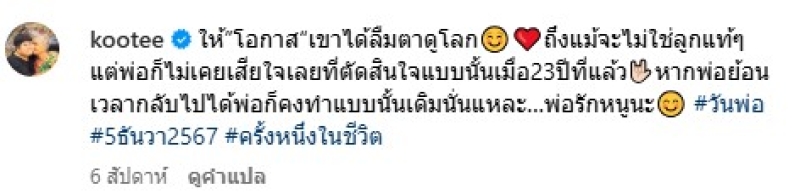 ให้โอกาสเข้าได้ลืมตาดูโลก ถึงแม้จะไม่ใช่ลูกแท้ๆ แต่พ่อก็ไม่เคยเสียใจเลยที่ตัดสินใจแบบนั้นเมื่อ 23 ปีที่แล้ว หากพ่อย้อนเวลากลับไปได้ พ่อก็คงทำแบบนั้นเหมือนเดิมนั่นแหละ…พ่อรักหนูนะ ซึ่งหลังจากที่ด้าน โก๊ะตี๋ ได้ออกมาโพสต์แคปชั่นดังกล่าวนี้ ไม่นานก็มีทั้งเหล่าเพื่อนๆในวงการบันเทิงและแฟนคลับเข้ามาคอมเมนต์ส่งหัวใจกันรัวๆเลยทีเดียว บ้างก็บอกว่า อ่านแล้วอบอุ่นหัวใจ เป็นต้น