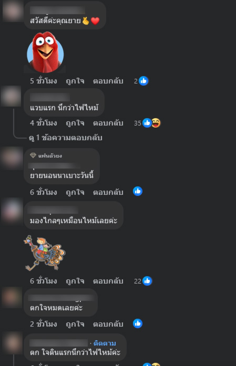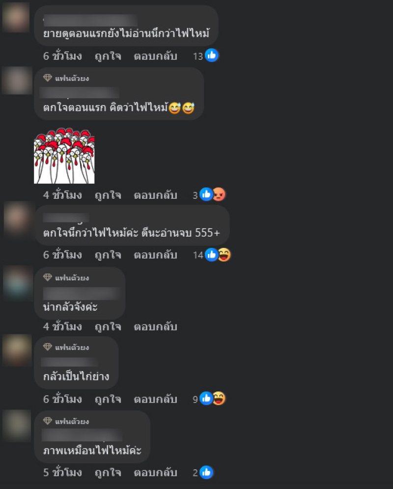 ท่ามกลางชาวเน็ตเข้ามาคอมเมนต์กันอย่างมาก อาทิ แวบแรก นึกว่าไฟไหม้,มองไกลๆเหมือนไหม้เลยค่ะ,ตก ใจตินแรกนึกว่าไฟไหม้ค่ะ,ตกใจนึกว่าไฟไหม้ค่ะ ดีนะอ่านจบ 555+,กลัวเป็นไก่ย่าง เป็นต้น
