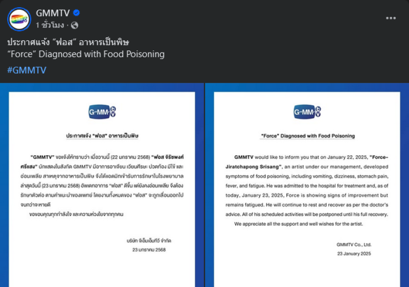 สาเหตุจากอาหารเป็นพิษ จึงได้แอดมิทเข้ารับการรักษาในโรงพยาบาล ล่าสุดวันนี้ (23 มกราคม 2568) อัปเดตอาการ ฟอส ดีขึ้น แต่ยังคงอ่อนเพลีย จึงต้องรักษาตัวต่อตามคําแนะนําของแพทย์ โดยงานทั้งหมดของ ฟอส จะถูกเลื่อนออกไปจนกว่าจะหายดี ขอขอบคุณทุกกําลังใจ และความห่วงใยจากทุกคน