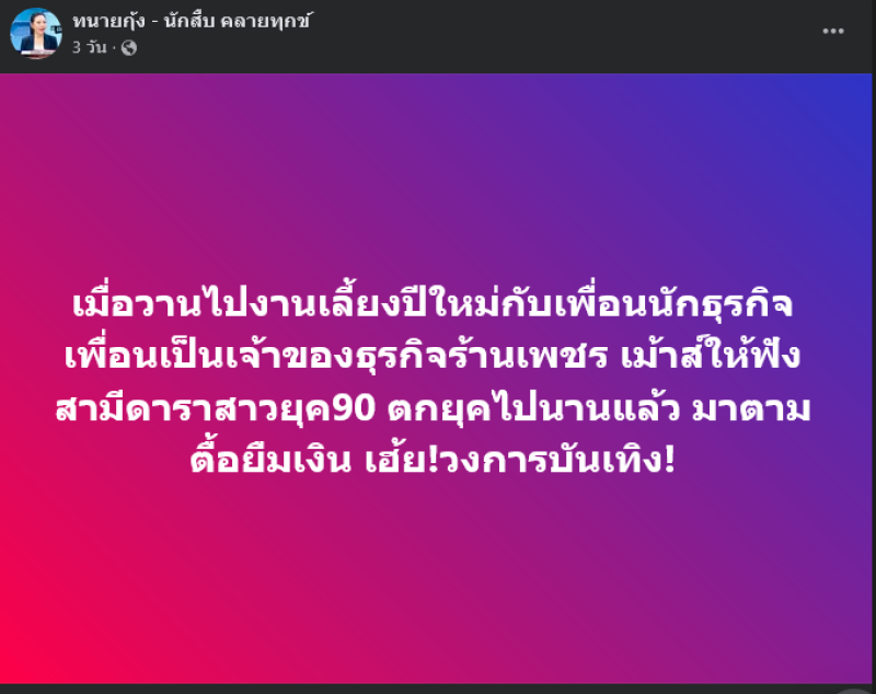 เรียกได้มีเรื่องของวงการบันเทิงมาให้ได้ชาวเน็ตได้ค้นหากันอีกแล้วเมื่อล่าสุดทางด้านเพจเฟซบุ๊ค ทนายกุ้ง - นักสืบ คลายทุกข์ ได้ออกมาโพสต์ความถึงสามีดาราสาวยุค 90 โดยระบุข้อความว่า เมื่อวานไปงานเลี้ยงปีใหม่กับเพื่อนนักธุรกิจ เพื่อนเป็นเจ้าของธุรกิจร้านเพชร เม้าส์ให้ฟัง สามีดาราสาวยุค90 ตกยุคไปนานแล้ว มาตามตื้อยืมเงิน เฮ้ย!วงการบันเทิง!