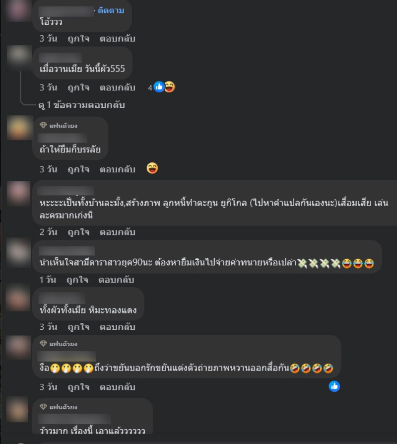 งานนี้ทำเอาชาวเน็ตหลายคนต่างเข้ามาคอมเมนต์กันอย่างมาก อาทิ เมื่อวานเมีย วันนี้ผัว555,น่าเห็นใจสามีดาราสาวยุค90นะ ต้องหายืมเงินไปจ่ายค่าทนายหรือเปล่า,ว้าวมาก เรื่องนี้ เอาแล้ว,น่าจะศีลเสมอ .มิน่าล่ะไม่มีใครห้ามใคร,คนนั้น, ใช่คนเดียวกับน้องลิลลี่ คุณลูกหมี โดนมาใช่ไหมคะ ? เป็นต้น