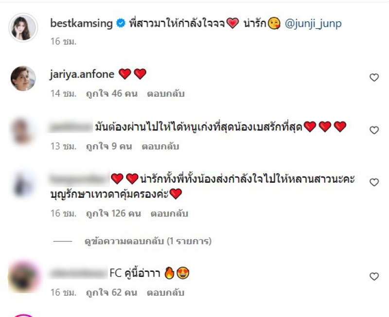 ล่าสุดทางลูกสาว เบสท์ รักษ์วนีย์ คำสิงห์ ก็ได้เผยคลิปเต้นกับรุ่นพี่ดารา อย่าง จันจิรา จันทร์พิทักษ์ชัย แฟนสาวของพระเอกดัง มาริโอ้ พร้อมระบุแคปชั่นว่า พี่สาวมาให้กำลังใจจจ น่ารัก @junji_junp