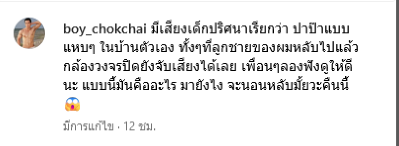 เรียกได้ว่าเป็นอีกหนึ่งนักแสดงหนุ่มสำหรับ บอย โชคชัย ที่ล่าสุดได้ออกมาโพสต์คลิปผ่านทางอินสตาแกรม boy_chokchai ที่ทำเอาแฟนๆต่างขนลุกเมื่อได้ยินเสียงเรียกปะป๊า ทั้งที่ลูกหลับเเล้ว และได้นั่งเล่นอยู่คนเดียว พร้อมเขียนแคปชั่นว่า