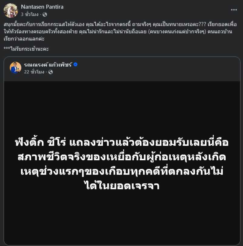 ต่อมาทางด้านภรรยาของ ติ๊ก ชิโร่ ได้แชร์โพสต์ของทนายรณณรงค์ พร้อมเขียนข้อความผ่านทางเฟซบุ๊ค Nantasen Pantira ว่า สนุกมั้ยคะกับการเรียกกระแสให้ตัวเอง คุณได้อะไรจากตรงนี้ ถามจริงๆ คุณเป็นทนายเหรอคะ??? เรียกยอดเพื่อให้ทัวร์ลงทางครอบครัวทั้งสองฝ่าย คุณไม่น่ารักและไม่น่านับถือเลย (คนบางคนเก่งแต่ปากจริงๆ) คนแถวบ้านเรียกว่าลอกแลกค่ะ ***ไม่รับกระเช้านะคะ