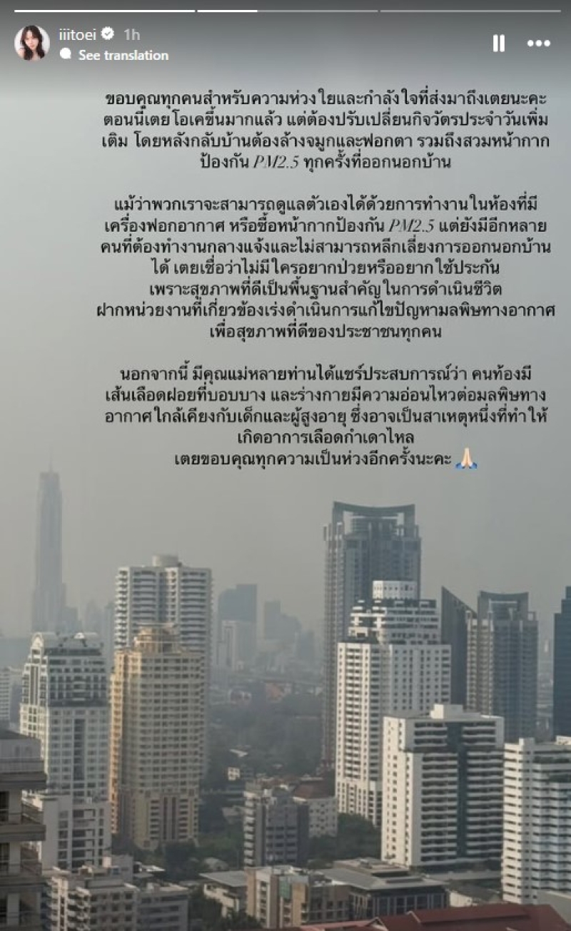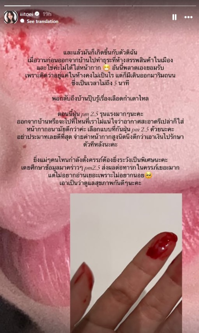 ที่ล่าสุด ได้ออกมาแชร์ประสบการณ์ส่วนตัว ขณะที่ตนได้ออกไปนอกบ้าน ณ ห้างสรรพสินค้า ใช้ชีวิตตามปกติ แต่ทว่าวันนั้นกลับไม่ได้ใส่แมสไปด้วย และแล้วสิ่งที่ไม่คาคคิดก็ได้เกิดขึ้น เมื่อตอนที่ถึงบ้านพบว่า เลือดกำเดาไหลออกมาแบบไม่รู้ตัว ซึ่งสาวใบเตยยังได้เผยอีกว่า ยอมรับว่าตนพลาดเอง คิดว่าแค่อยู่ในห้างคงไม่เป็นอะไร พร้อมกล่าวเสริมว่า อย่าประมาทดีที่สุด จ่ายค่าหน้ากากสูงนิดนึง ดีกว่าเอาเงินไปรักษาตัวทีหลังนะคะ อีกทั้ง ฝุ่น PM 2.5 ยังส่งผลต่อทารกในครรภ์เยอะมาก แต่ไม่อยากอ่านเยอะเพราะไม่อยากนอย เอาเป็นว่าดูแลสุขภาพกันดีๆนะคะ