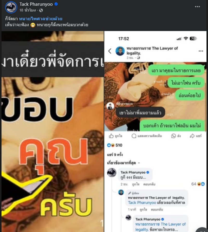 ต่อมาได้เผยแชทพร้อมเขียนโพสต์ว่า ก็จัดมา ทนายไพศาลช่วยด้วย เห็นว่าจะฟ้อง ทนายxูก็ตึงนะพร้อมบวกด้วย