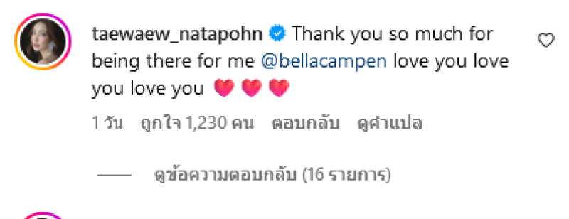 ทั้งนี้ทางด้าน แต้ว ได้เข้ามาคอมเมนต์ว่า Thank you so much for being there for me @bellacampen love you love you love you บอกเลยว่าน่ารักกันมากๆ