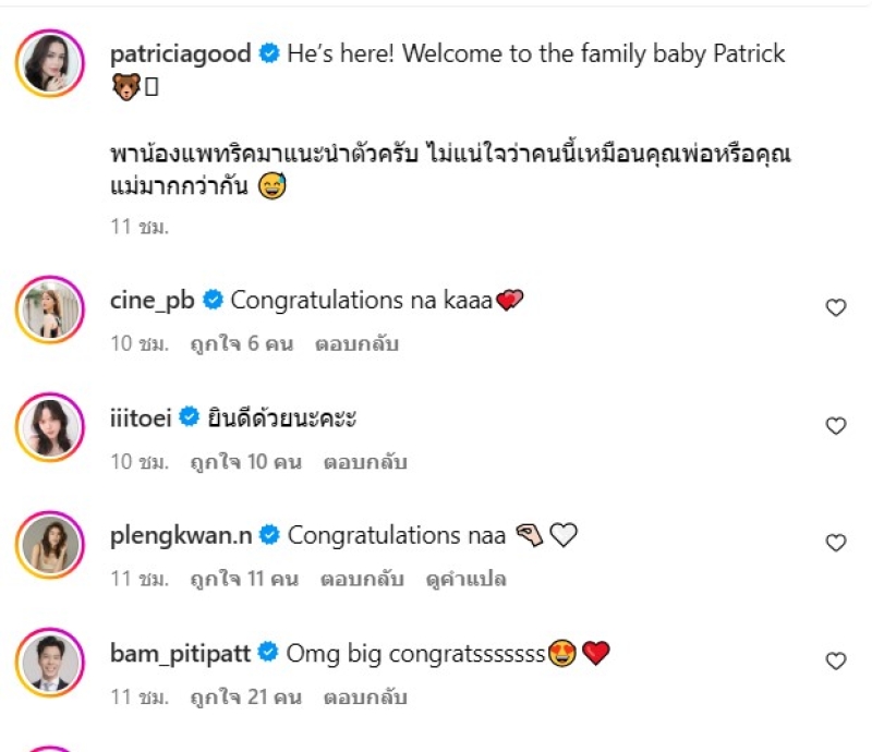 เรียกได้ว่า เป็นคุณพ่อและคุณแม่ลูกสอง เต็มตัวแล้ว สำหรับ แพทริเซีย และสามี โน๊ต วิเศษ และ น้องเอลิเซีย ก็เป็นพี่สาวเต็มตัวเช่นกัน โดยก่อนหน้านั้น ด้านคุณหมอได้ออกมาเผยภาพลูกชายของ แพทริเซียกับสามี แต่เห็นไม่ชัดเท่าไร ท่าทางจะหล่อเหมือนคุณพ่อน่าดู ล่าสุดทางแพทริเซีย ได้ออกมาเผยโฉมลูกชายแบบเต็มๆให้แฟนๆได้ชมกัน พร้อมระบุแคปชั่นว่า He’s here! Welcome to the family baby Patrick พาน้องแพทริคมาแนะนำตัวครับ ไม่แน่ใจว่าคนนี้เหมือนคุณพ่อหรือคุณแม่มากกว่ากัน
