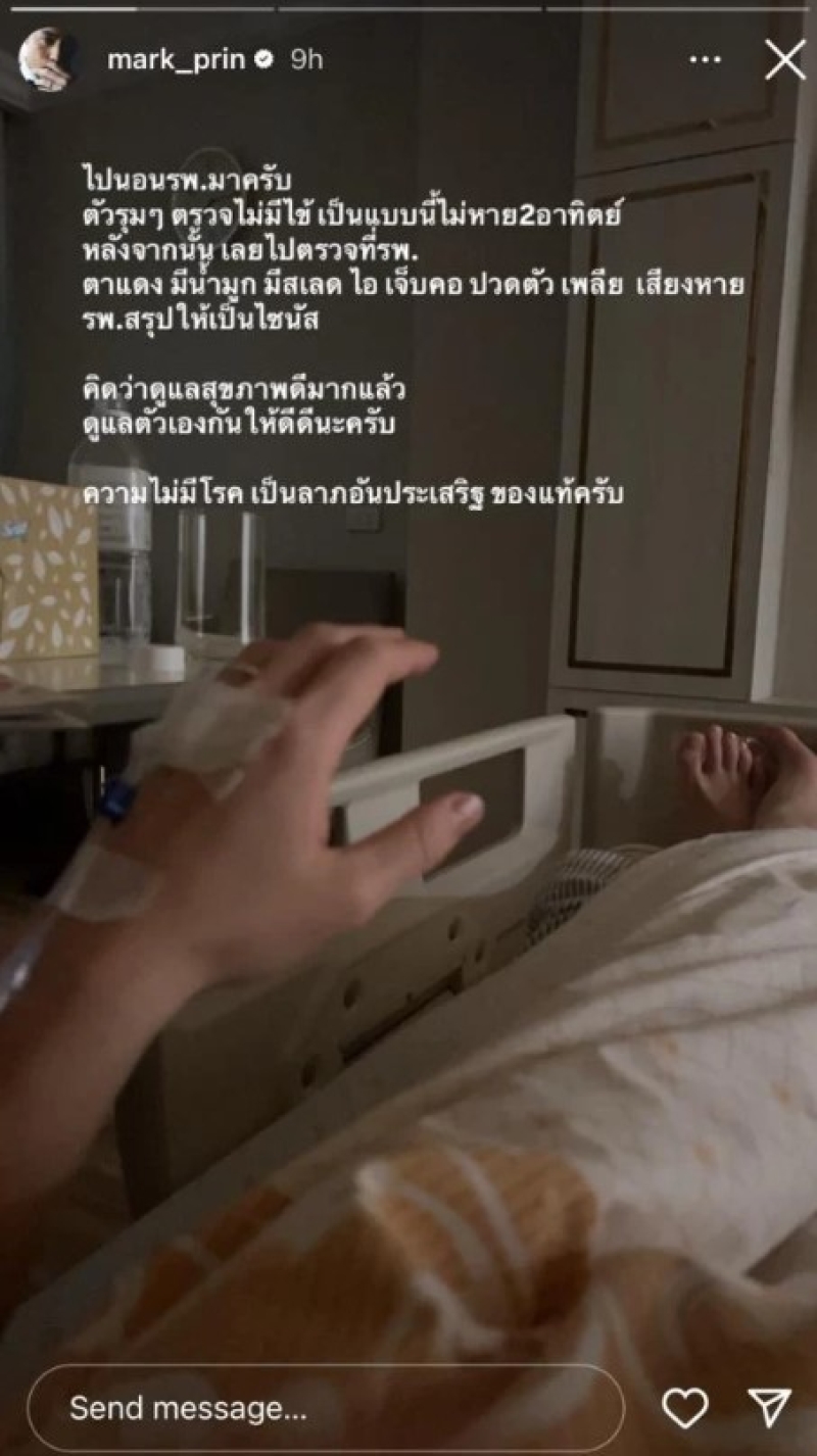กระทั่ง ต้องหามส่งแอดมิทที่โรงพยาบาล ก่อนที่แพทย์จะวินิจฉันว่าเป็นไซนัส โดยในเวลาต่อมา ด้านเจ้าตัว ได้ออกมาโพสต์ไอจีสตอรี่ เป็นภาพที่ตัวเองกำลังนอนให้น้ำเกลืออยู่บนเตียง พร้อมเขียนแคปชั่น ในทำนองว่า ตนนอน รพ. มา เพราะมีอาการตัวรุมๆ ตรวจแล้วไม่พบไข้ เป็นแบบนี้มา 2 อาทิตย์ หลังจากนั้นไป รพ. ตาแดง มีน้ำมูก เสลด ไอ เจ็บคอ ปวดหัว เพลีย เสียงหาย รพ.สรุปให้เป็นไซนัส คิดว่าดูแลสุขภาพดีแล้ว พร้อมกล่าวเสริมว่า การไม่มีโรค เป็นลาภอันประเสริฐ