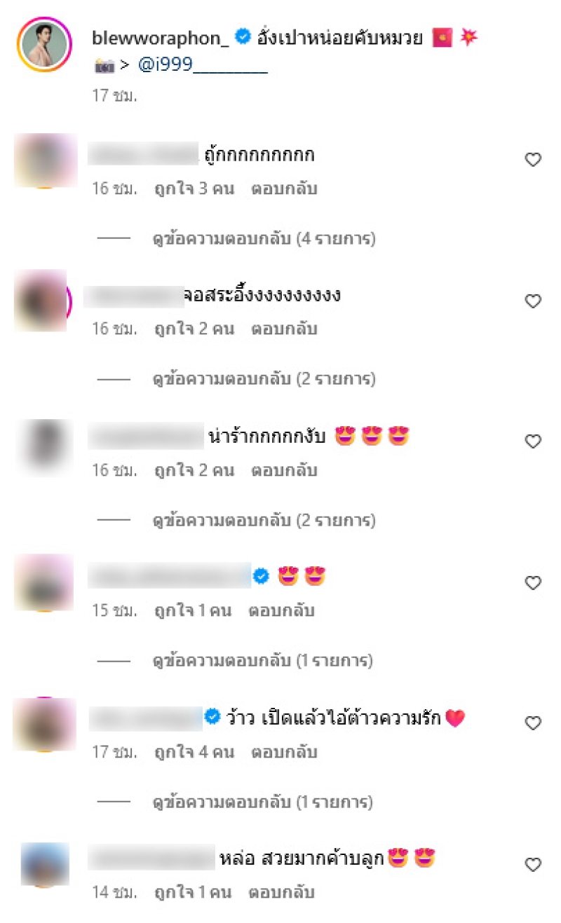 ท่ามกลางเพื่อนในวงการเเละเเฟนต่างเข้ามาคอมเมนต์แซวกันอย่างมาก อาทิ ว้าว เปิดแล้วไอ้ต้าวความรัก,หล่อ สวยมากค้าบลูก,โคตรจะถูกต้อง!!!,จอสระอึ้ง,หวานเจี๊ยบน้องรัก,กรี้ด เป็นต้น