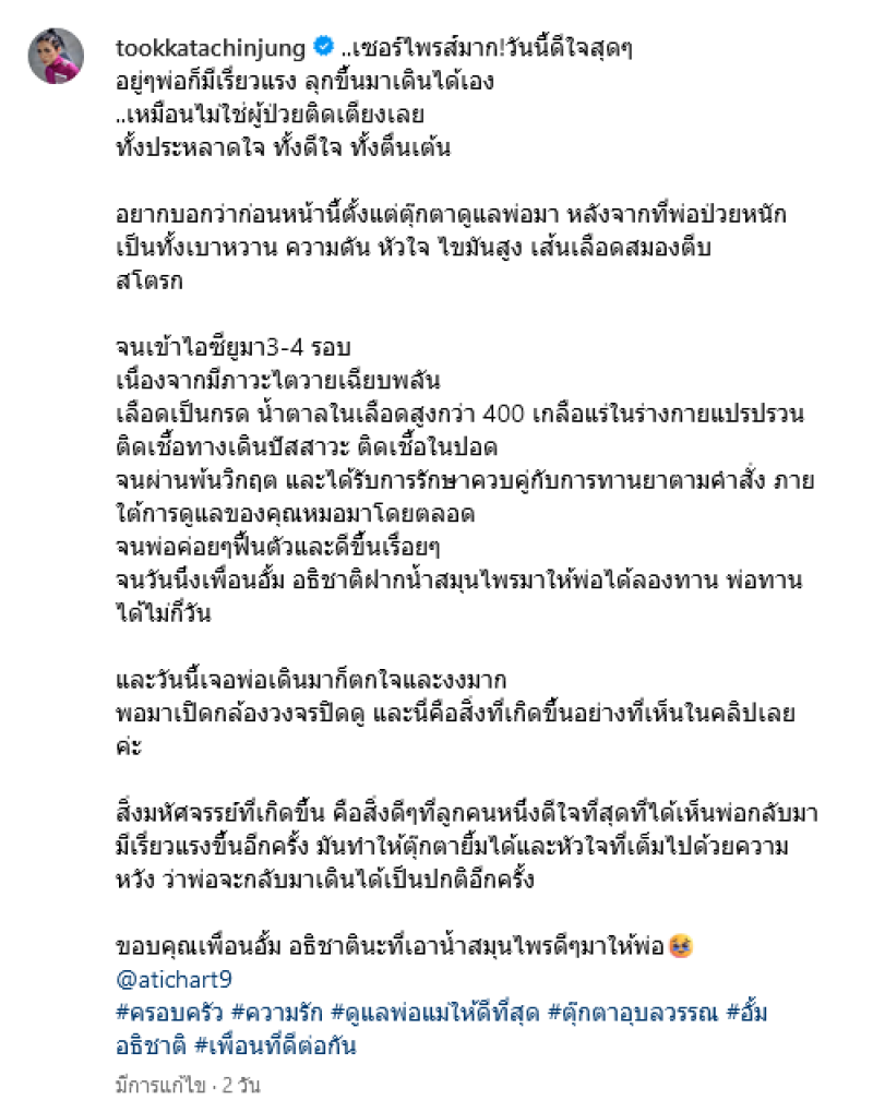สิ่งมหัศจรรย์ที่เกิดขึ้น คือสิ่งดีๆที่ลูกคนหนึ่งดีใจที่สุดที่ได้เห็นพ่อกลับมามีเรี่ยวแรงขึ้นอีกครั้ง มันทำให้ตุ๊กตายิ้มได้และหัวใจที่เต็มไปด้วยความหวัง ว่าพ่อจะกลับมาเดินได้เป็นปกติอีกครั้ง ขอบคุณเพื่อนอั้ม อธิชาตินะที่เอาน้ำสมุนไพรดีๆมาให้พ่อ @atichart9 #ครอบครัว #ความรัก #ดูแลพ่อแม่ให้ดีที่สุด #ตุ๊กตาอุบลวรรณ #อั้มอธิชาติ #เพื่อนที่ดีต่อกัน