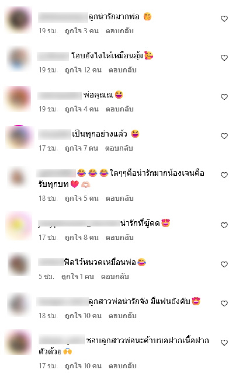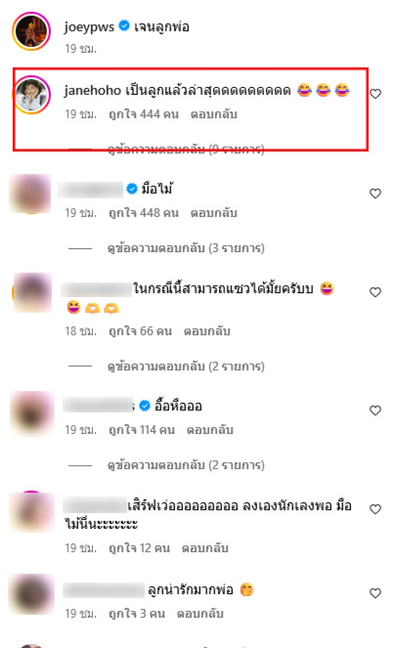 พร้อมเขียนแคปชั่นว่า เจนลูกพ่อ ท่ามกลางแฟนๆต่างเข้ามาคอมเมนต์แซวกันอย่างมาก ทั้งนี้ เจน ยังได้เข้ามาคอมเมนต์อีกด้วยว่า เป็นลูกแล้วล่าสุด เเละอาทิ มือไม้,ในกรณีนี้สามารถแซวได้มั้ยครับ,อื้อหือ,ใดๆๆคือน่ารักมากน้องเจนคือรับทุกบท,ลูกสาวพ่อน่ารักจัง มีแฟนยังคับ,ชอบลูกสาวพ่อนะค้าบขอฝากเนื้อฝากตัวด้วย เป็นต้น