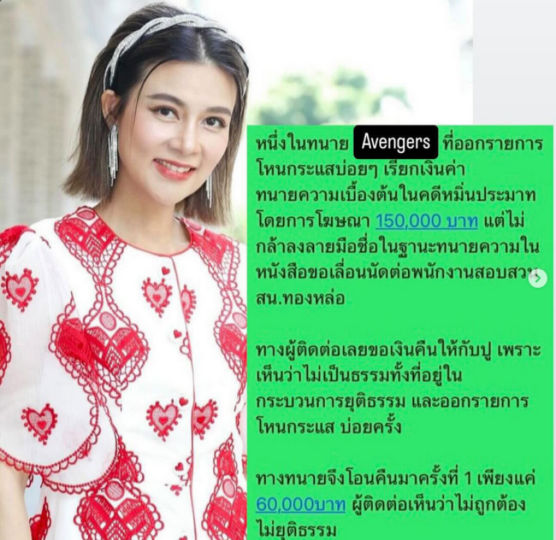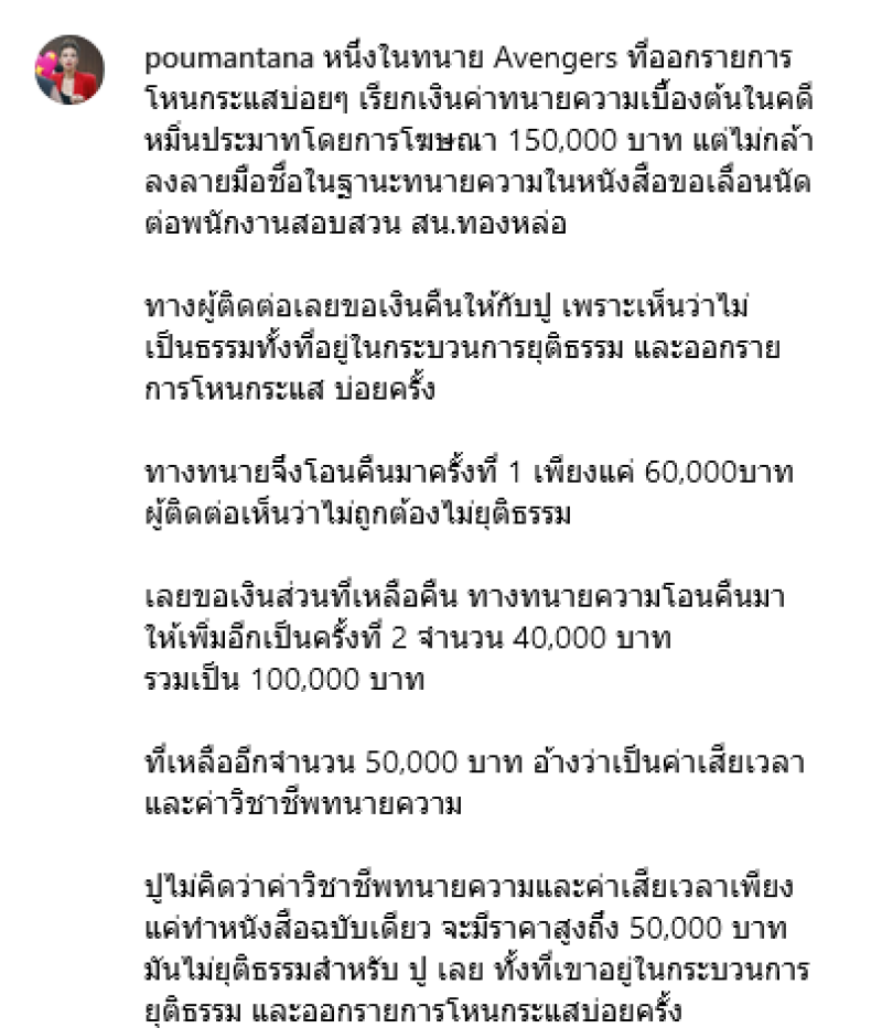 ทำเอาเดือดสนั่นโซเชียลเลยทีเดียวเมื่อ ปู มัณฑนา ได้ออกมาโพสต์ข้อความร่ายยาวถึงทนายที่ได้ออกรายการโหนกระเเสบ่อยๆ โดยได้เขียนโพสต์ว่า หนึ่งในทนาย Avengers ที่ออกรายการโหนกระแสบ่อยๆ เรียกเงินค่าทนายความเบื้องต้นในคดีหมิ่นประมาทโดยการโฆษณา 150,000 บาท แต่ไม่กล้าลงลายมือชื่อในฐานะทนายความในหนังสือขอเลื่อนนัดต่อพนักงานสอบสวน สน.ทองหล่อ