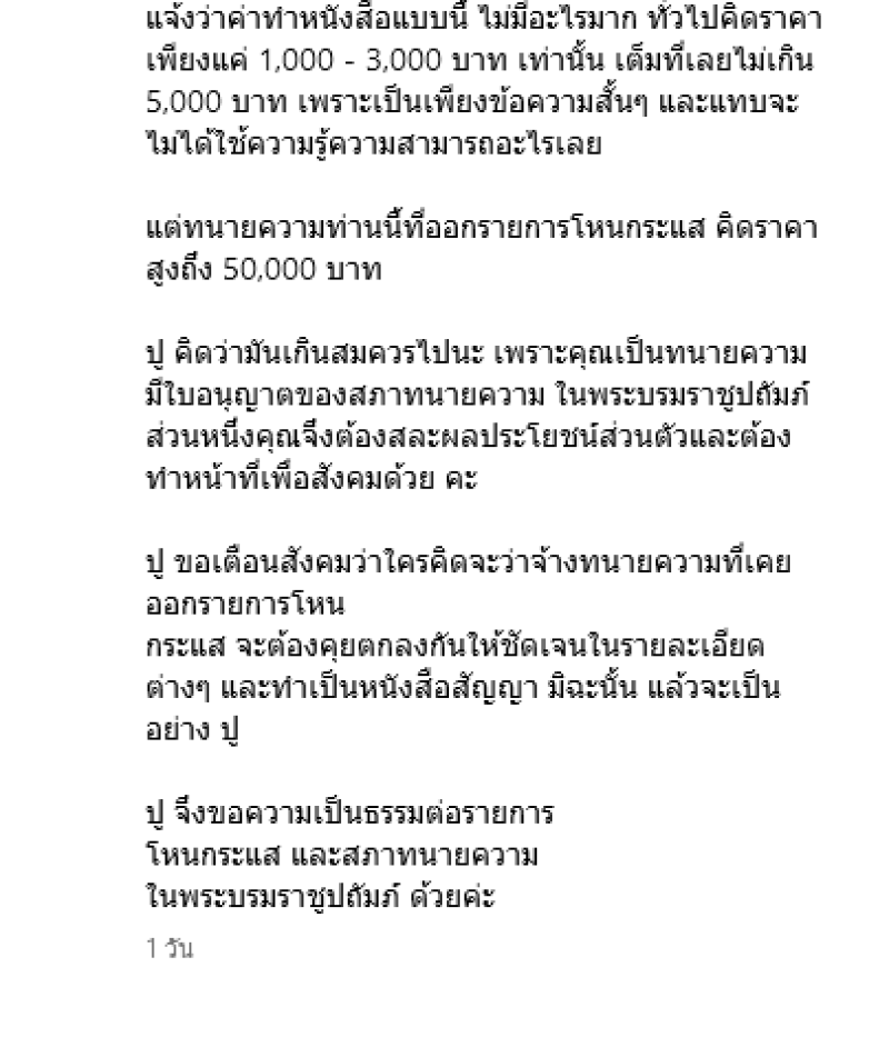 ปู ไปสอบถามทนายความท่านอื่นทนายความท่านอื่นแจ้งว่าค่าทำหนังสือแบบนี้ ไม่มีอะไรมาก ทั่วไปคิดราคาเพียงแค่ 1,000 - 3,000 บาท เท่านั้น เต็มที่เลยไม่เกิน 5,000 บาท เพราะเป็นเพียงข้อความสั้นๆ และแทบจะไม่ได้ใช้ความรู้ความสามารถอะไรเลย แต่ทนายความท่านนี้ที่ออกรายการโหนกระแส คิดราคาสูงถึง 50,000 บาท ปู คิดว่ามันเกินสมควรไปนะ เพราะคุณเป็นทนายความ