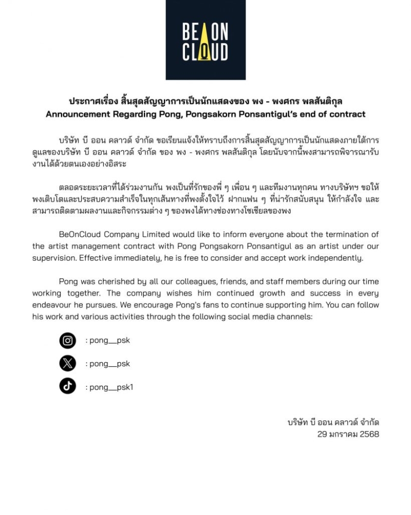 บริษัท บี ออน คลาวด์ จำกัด ขอเรียนแจ้งให้ทราบถึงการสิ้นสุดสัญญาการเป็นนักแสลงภายใต้การ ดูแลของบริษัท ปี ออน คลาวด์ จำกัด ของ พง - พงศกร พลสันติกุล โดยนับจากนี้พงสามารถพิจารณารับงานได้ด้วยตนเองอย่างอิสระ