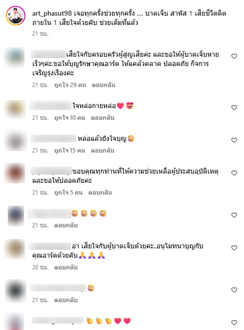 ท่ามกลางแฟนๆต่างเข้ามาคอมเมนต์ชื่นชมกันอย่างมาก อาทิ ใจหล่อกายหล่อ,ขอบคุณทุกท่านที่ให้ความช่วยเหลือผู้ประสบอุบัติเหตุ และขอให้ปลอดภัยค่ะ,ขอให้ปลอดภัยนะคะ,ผมว่าพี่หล่อที่สุดแล้วทั้งหน้าตาและจิตใจ,ขอให้ปลอดภัยค่ะ เป็นต้น