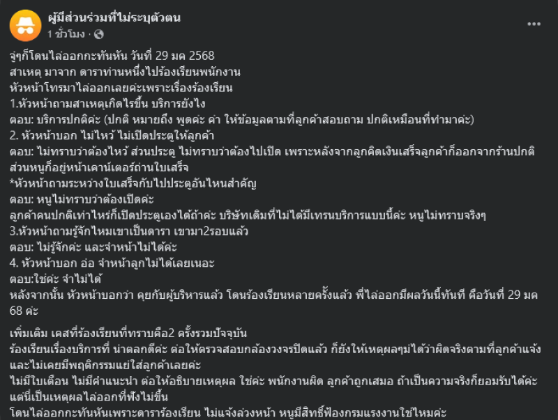 หลังจากนั้น หัวหน้าบอกว่า คุยกับผู้บริหารแล้ว โดนร้องเรียนหลายครัังแล้ว พี่ไล่ออกมีผลวันนี้ทันที คือวันที่ 29 มค 68 ค่ะ